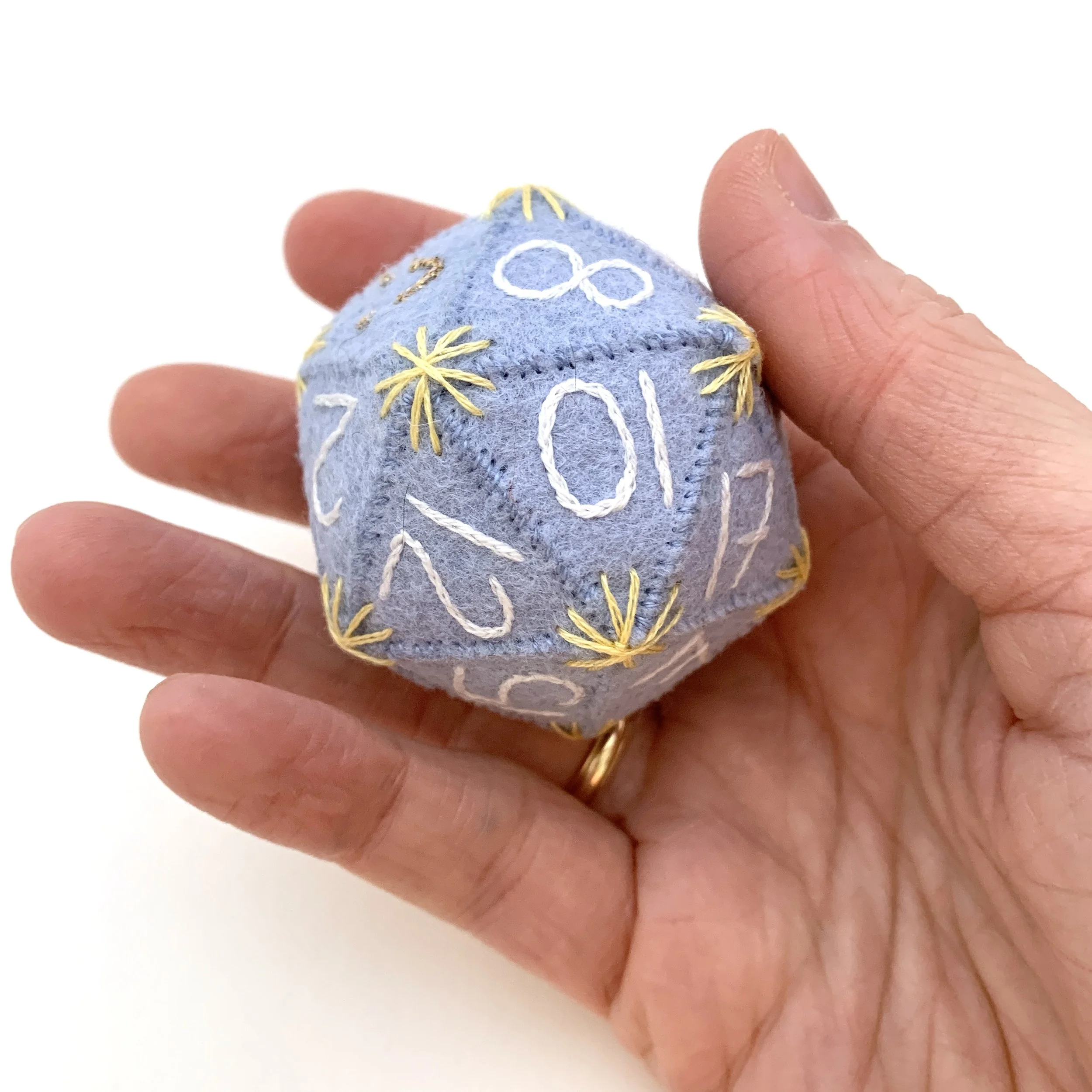 Hand-embroidered numbers on wool felt with cotton and metallic floss, stuffed with scraps of felt, approx 2” across. See last photo for size reference compared to a standard D20. This die has a smiley face and frowny face in place of the 20 and 1 faces.